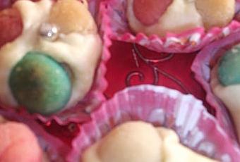 Former des petites boules de la grosseur d'une bille , abaisser la pâte au rouleau en couche fine, couper ds triangles 7 cm de coté;poser les 3 boules au couleurs differentes au milieu de chaque triangle. , rabattre les angles vers le centre en laissant apparaitre les 3 couleurs de pate d'amandes et piquer le centre avec une boule argentée ou un clou de girofle