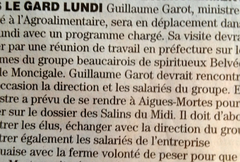 Ensuite, nous irons à la rencontre des élus locaux, des salariés et de la direction des Salins du Midi à Aigues-Mortes, afin de tout faire pour renouer le dialogue entre direction, salariés et élus, et pérenniser ce site emblématique des Salins et ses emplois.
