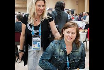 Ci-contre, Judit Polgar, encouragée par sa soeur Susan, a annulé hier au 3e échiquier face à Sergey Karjakin sur une Défense Berlinoise, dans le duel serré Hongrie 1½-2½ Russie - Photo David Llada © site officiel