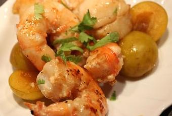 Faites chauffer votre poêle et déposez la noix de beurre. Lorsque la poêle est bien chaude, déposez en premier les gambas dans la poêle. Laissez-les cuire 3 mn puis retournez-les. Lorsque vous retournez les gambas, ajoutez les noix de St Jacques dans la poêle et laissez-les dorer pendant 2 mn de chaque côté. Pendant ce temps, coupez les mirabelles en deux, ôtez le noyau et déposez-les dans les coupelles. (2 mirabelles par coupelle.)