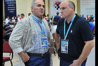 Après l'affaire des Pussy Riot, revoilà Garry Kasparov, cette fois aux Olympiades d'échecs d'Istanbul en compagnie de l'entraîneur russe Yuri Dokhoian. A voir, la partie du jour avec la très belle victoire du Russe Vladimir Kramnik face à l'Arménien Levon Aronian. Sacrifice de cavalier pour dégager le terrain à ses pions passés a et b - Photo © site officiel