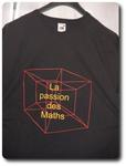 Coté face un hypercube en fond de "La passion des maths" et coté pile la photo montage avec mes deux statues et voilà le résultat (un peu bancal, mais essayez donc de photographier un T-shirt, noir qui plus est !):