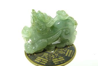 Pi Xiu impérial en jade sur pièce ba gua en cuivre.Pour les amateurs avertis: un Pi Xiu impérial en jade.Comme tout Pi Xiu impérial il a de superbes ailes, il relève fièrement la tête. Il est en plus décoré avec un lingot Chinois sur le dos et le symbole Chinois Ruyi entre les pattes avant.Un détail important, il a sous son corps 3 pièces Chinoise.Il trône sur une pièce Ba Gua en cuivre offerte.Le Pi Xiu est un des fils de Dragon Céleste. Vivace et avec un appétit féroce, il violat un jour une des loi du Palais de Jade, pour le punir l'empereur de Jade lui supprima son anus l'empêchant ainsi d'expulser les richesses ingurgitées. Depuis ce temps, il symbolise en Chine la conquête et le gain.