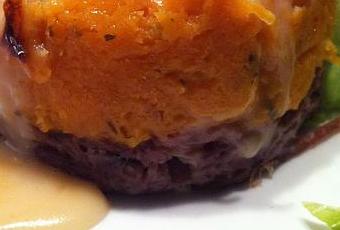 Frottez les cercle avec un peu de graisse que vous disposer sur une plaque de four. Tapissez le fond de ces cercles avec les filaments de canard. Recouvrez de purée de patate douce aux amandes. Enfournez pour une vingtaine de minutes.