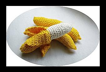 Répéter le tour 32 encore 2 fois = il reste 8 ms. Rembourrer la banane avec un peu d'ouate. Au tour suivant, diminuer 2 ms = il reste 6 ms, couper le fil et coudre ens les 6 dernières m avec