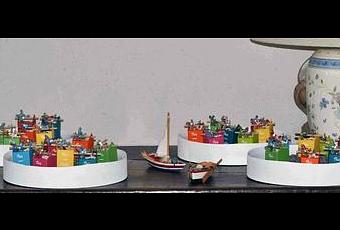 Des boîtes de dragées de toutes les couleurs, des coquillages, des rubans liberty, des perles goutes d'eau, des perles poissons, bateau et pêcheur, du verni, un peu de colle et voilà le résulta...