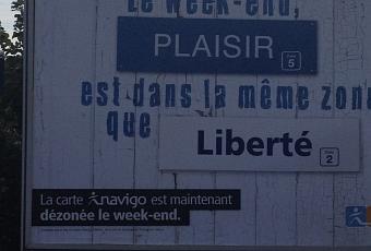Depuis le 1er septembre, quelque soit le nombre de zones de votre passe Navigo, vous pouvez circuler tout le week-end sur toute l’Ile-de-France. Ainsi, comme le rappelle avec humour une des pubs de la campagne d’information lancée par le Stif pour faire connaître cette nouvelle liberté, « Le week-end, Plaisir (zone 5) est dans la même zone que Liberté (zone 2) ! »