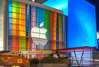 En effet, la Pomme a pour habitude d’habiller le Yerba Buena Center, le centre de convention où son patron donne les fameuses Keynotes, aux couleurs de l’évènement.