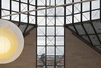 on reprend cette rentrée 2012 avec un projet un brin mystérieux, réalisé par la designeuse bruxelloise Nathalie Dewez pour fêter le cinquième anniversaire du MUDAM, le musée d’art moderne de/du Luxembourg (du Luxembourg : la nation – de Luxembourg : la ville. Luxembourg que nous saluons bien sur au passage à l’occasion de ce billet de reprise. L’intervention se présente sous la forme d’un mobile, fait d’un bras accueillant à ses extrémités deux sphères, et pas plus. Celle qui éclaire (la sphère) est faite de trois ballons imbriqués les uns dans les autres. Le plus petit éclaire les autres. La société Climalux – le chauffage, le sprinklage, la ventilation en Luxembourg, une vénérable trentenaire que nous saluons au passage – a offert l’installation, la société française Airstar (leader mondial du ballon éclairant, cocorico, nous te saluons au passage Airstar) à participé à sa mise au point technique. Voila pour le générique. Après, quel est le concept, l’idée de départ du mobile, ça bouge-ti, ça bouge-ti pas, tout cela est encore une fois bien mystérieux. Nathalie, si tu nous lis…