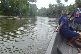 Après 5 heures passées au fond d'une coque de noix propulsée par deux moteurs surdimensionnés, nous retrouvons la terre ferme à Aitape, prêts à reprendre la route à vélo.
