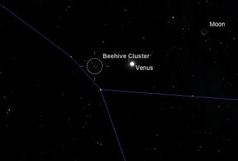 Vénus en « pince » pour l’amas ouvert Messier 44 (également nommé, la Ruche, la « Crêche » ou « La petite brume » par le poète de l’antiquité grecque Aratos) ! La planète brille à proximité d’une fratrie comptant environ un millier de jeunes étoiles.