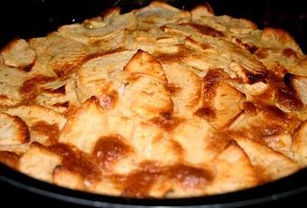 Eplucher les pommes, les couper en petits morceaux et en garnir le fond d'un moule 22cm ou dans 6 ramequins .Melanger les oeufs, le sucre, le lait, le beurre, la farine et le levure. Fouetter jusqu'à obtenir une pate bien homogene et verser dans le moule sur les pommes.