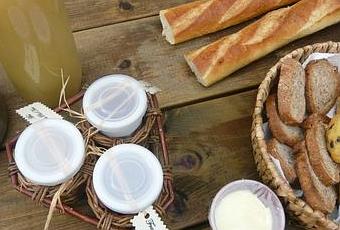 De la dînette à foison, j'adore !!! Petit pot de beurre, petits pots de confitures faites maison avec également, miel maison, muffins, jus de poire et des thermos pour le cacao et l'eau du thé !