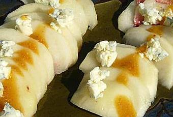 Pêches au Roquefort et vinaigrette aux framboises