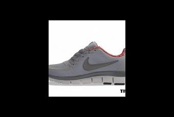 Les runnings ont un dessus en daim et mesh gris contrastés par une doublure bicolore rouge et grise accompagnées d’une semelle Nike Free 5.0.