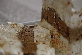 Dans une boîte pouvant aller au congélateur, placer la moitié de la préparation et bien la lisser / tasser. Placer ensuite par dessus toute la glace en une couche uniforme. Terminer par l'autre moitié de crème à la meringue en lissant bien le dessus.