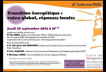 40è conférence PHARE "Transition énergétique : enjeu global, réponses locales" le jeudi 27 septembre 2012 à 18 h 30 à l'Ecole de Management Strasbourg (61, avenue de la Forêt-Noire).Dans la grande tradition des CONFÉRENCES PHARE ayant pour ambition de jeter des ponts entre la recherche académique (en s'appuyant notamment sur les domaines de recherche des Chaires d'entreprises, dans le cas présent : la Chaire d’entreprises "développement durable" - et sur les domaines de formation de l’école) et les pratiques en entreprise ; les experts tenteront notamment de répondre aux questions suivantes :