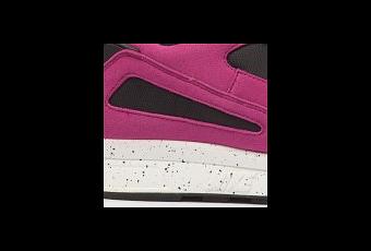 Les sneakers ont un dessus en néoprène noir contrasté par du daim et une sangle élastique fushia et une semelle intermédiaire blanche tachetée.