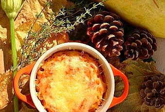 Je pensais tout d'abord réaliser un velouté mais cette courge ne s'y prête pas ! Les longs filaments qui la composent se dégustent en salade, en quiche ou encore en gratin. J'ai opté pour la dernière solution, en y ajoutant une touche un peu plus estivale, à savoir des tomates aillées au thym (de mon jardin !).