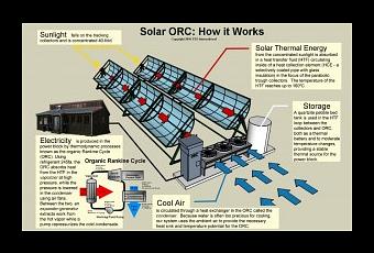 De grands miroirs paraboliques élèvent à plus de 150 °C un fluide en circuit fermé, qui permet de vaporiser un réfrigérant similaire à celui que vous trouvez dans les réfrigérateurs. Ce gaz en expansion met en mouvement une turbine, qui produit 3 kW d’électricité. Il est ensuite refroidi par l’air ambiant dans un condensateur, pour retourner à l’état liquide avant de continuer le cycle.