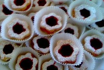 Une fois assemblés, saupoudrer les sablés de sucre glace à l'aide d'un petit tamis et finir en déposant une goutte de confiture au milieu.