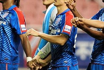 Eyes on the ball: Drogba fends off Liaoning Whowin's Wu Gaojun