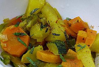 Emincer l'oignon et le faire fondre dans l'huile d'olive et le curry. Pendant ce temps, vous pouvez détailler tous les autres légumes. Ajouter les légumes et mouiller avec un verre d'eau. Laisser cuire à couvert pendant 15 à 20 mn. Au moment de servir saupoudrer de menthe fraîche ciselée... Et envolez-vous !!!