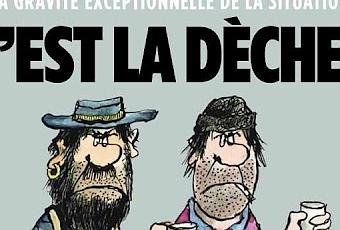 C'est la dèche! C'est ce que j'ai dit à mon adorable banquier samedi matin.Sinon c'est la couverture de Siné Mensuel et c'est le premier anniversaire du journal qui fait mal et ça fait du bien, avec une petite pensée délicate pour François Hollande.