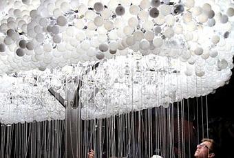 "Cloud" est une installation interactive. Créé à partir d'acier, chaînes de traction en métal, et 6.000 ampoules, Caitlind a réinventé l'art du recyclage avec 6000 ampoules de récupération.