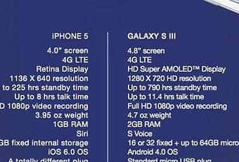 Cette attaque n’est pour une fois pas judiciaire mais publicitaire et n’est autre qu’une simple publicité comparative listant d’un côté les caractéristiques techniques de l’Iphone 5 et d’autre celles du Galaxy SIII sorti il y a déjà quelques semaines.