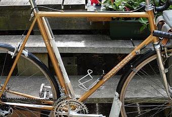 Voici un randonneur Motobécane monté sur mesure sur un cadre Grand Record. C'est un vélo de 1982 en très bon état d'origine. Après une petite révision, il a agrémenté mes randonnées estivales. Cadre brassé hauteur 60. Ensemble de pédalier Tevano, triple plateau 50, 42, 32. A l'arrière, moyeu Pelissier. Jantes Mavic. A l'avant, moyeu Maillard, jante Rigida. Freins Mafac. Cintre et Potence Philippe Atax. Dérailleurs Huret grande chape 15 vitesses. Selle Ideale. Garde-boue BlueMels. Compteur kilométrique et porte bagage avant avec sacoche Berthoud.