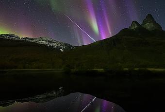 Ce 20 septembre, au cours d’une escapade dans le nord de la Norvége, dans les fôrets “aux couleurs d’automne” et au pied du Mont Otertinden (1 200 m. d’altitude) où coule “une rivière silencieuse”, le photographe Ole C. Salomonsen a capturé les grandes voiles colorées des aurores. “Le ciel était rempli d’impressionnantes aurores aux formes et aux couleurs magnifiques” raconte t’il. “J’ai également vu un(e) magnifique bolide/boule de feu (fireball) bleue. […] C’était le plus gros bolide que j’ai jamais photographié. Un grand moment photographique pour moi” ! Ce météore qui a fendu l’atmosphère a duré entre 6 et 7 secondes avant de disparaitre derrière cette montagne qu’il admire.