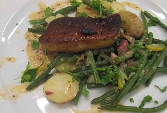 Salade liégeoise, foie gras poęlé, jus ŕ la moutarde ancienne et citron confit