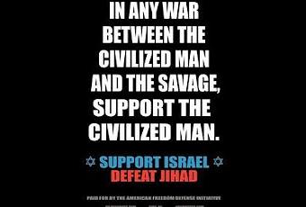 Dans toute guerre entre l'homme civilisé et le sauvage, soutenez l'homme civilisé.Soutenez IsraëlRejetez le JihadCette affiche émane d'une activiste américaine, Pamela Geller, qui prétend lutter contre l'islamisation des Etats-Unis. Pamela Geller dirige l'association American Freedom Defense Initiative.L'association avait acheté l'emplacement pour ces affiches il y a un an, disent-ils. Mais la NY Metropolitan Authority en avait empêché la pose et avait expliqué dans une lettre à l'organisation que "L'affiche que vous proposez contient des propos qui, selon nous, ne sont pas conformes avec les normes de la MTA pour l'affichage en ce qui concerne les annonces. Elles rabaissent une personne ou un groupe de personnes."