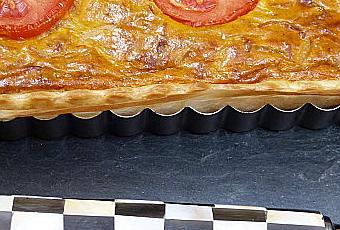 Une jolie fondue d'oignons (qui vous fera pleurer un peu !), du thon, une petite boîte de coulis de tomates, une tomate, 3 oeufs, crème fraîche, sel et poivre, pâte feuilletée.