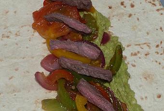 Chauffez vos tortillas comme indiqué sur leur emballage. Étalez-les et disposez y les légumes et le guacamole et votre viande par-dessus, servez aussitôt pour que ce soit chaud.