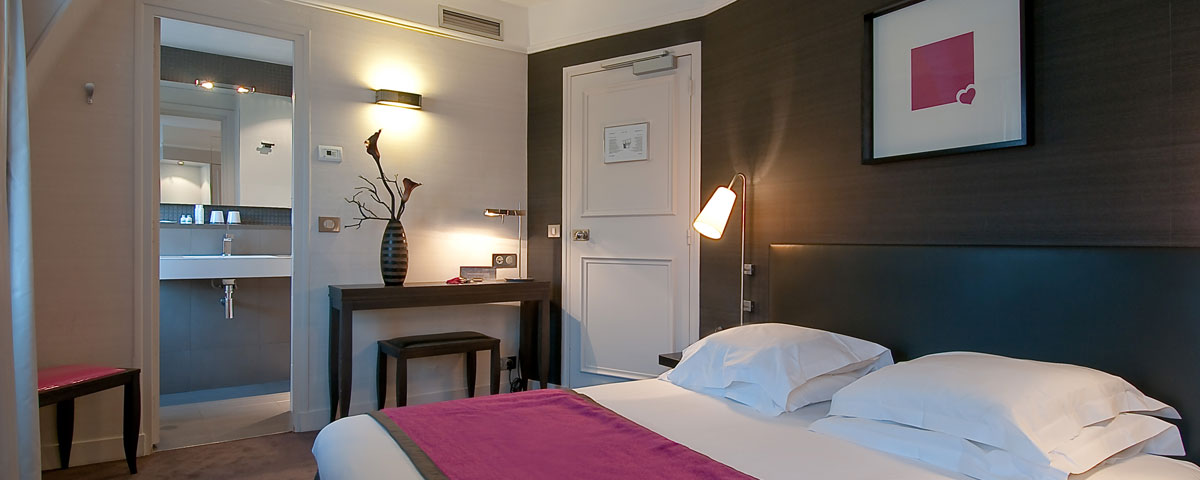 Bar au cactus chromé, coin salon et télé, ou petit-déjeuners, le tout en une belle harmonie de tons beige, anisé, chocolaté, et noir. Une élégance contemporaine fort judicieusement attribuée, et concoctée. Un saut d'ascenseur au premier, la 17 et la 14 seront pour quatre jours notre « destinée ». Des espaces certes mesurés (environ 15 à 20 m²) mais intelligemment appréhendés. Revêtement mural, façon poulain, chocolaté, bureau-console « accoudé », écran plat fixé, mini-bar encastré, penderie et coffre fort dissimulés, et, finalement, espace vital bien respecté. Seulement voilà, cela manquera quelque peu d'intimité ! Un espace trop épuré, mais fonctionnel à souhait, où l'on aura, par exemple, omis un simple fauteuil pour somnoler ! Côté salle de bains, le tête de nègre dominera incontestablement en dégradé de matériaux. Faïence, verre et chrome, radiateur, sèche-serviette, miroir grossissant, sèche-cheveux, poubelle à pied (hyper aisée) et cloison de douche vitrée qui, malheureusement, comme remarqué dans nombre d'hôtels, aura une nette tendance à laisser tout le sol arrosé ! Côté produits de bains, les Fragonard, sélectionnés par la propriétaire du lieu, Véronique Turmel, placeront la barre assez haut, là où d'autres se contenteront de l'Occitane, Natural, ou Damana ! Enfin, pour le petit-déj', ce ne sera pas la panacée, un modèle peu soigné, si ce n'est même expédié où le peaufiné, et le recherché, seront, indéniablement, exemptés ! Une (relative) déception pour les accrocs de plateaux « amoureusement » préparés !Tarif chambre n°17 : 300 à 380 €. Petit-déj' 15 €.