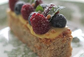 Découpez le financier en rectangle de 3 cm X 10 cm , déposez une couche pas trop épaisse de lemon curd . Disposez délicatement les fruits , des feuilles de menthe , des éclats de noisette , saupoudrez de sucre glace.