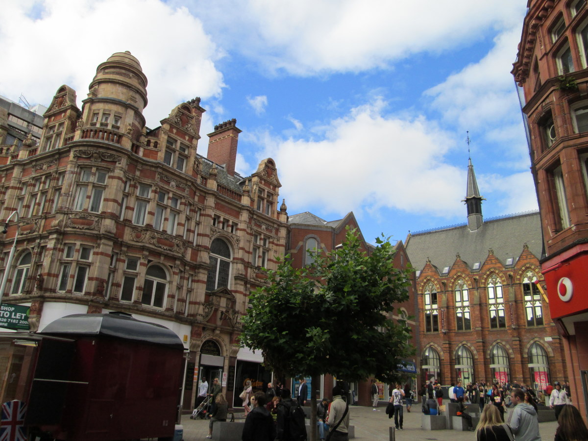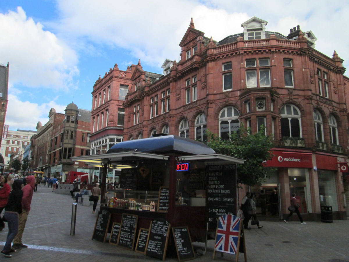 Dernière prise sur ce coin de rue, avec le kiosque-restaurant occupant le centre. Leeds permet la nourriture de rue, et le centre-ville comporte donc son lot de petits kiosques semi-mobiles qui proposent divers mets aux passants. Cette initiative contribue positivement à la vie urbaine.