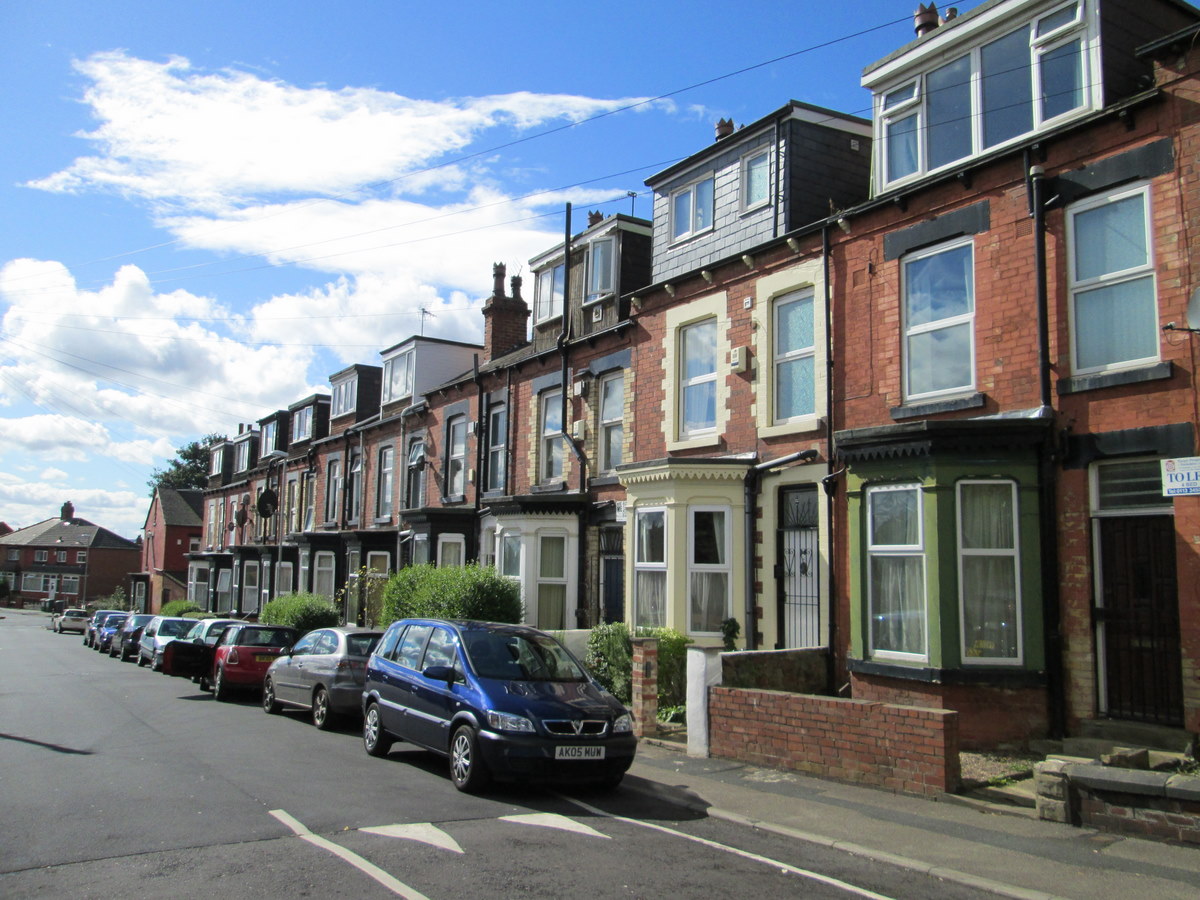 Voici la première vue que j'ai eu de Leeds. En réalité, c'est pas vrai, puisque je suis arrivé tard en soirée, à la gare ferroviaire et pris un taxi vers mon logis. Ceci donc, est la première vue, de jour, que j'ai eu de Leeds. C'est une rue perpendiculaire à celle où j'habite, directement devant chez moi. Mon quartier (officiellement Hyde Park, mais aux limites de Headingley) est fascinant par son architecture et son urbanisme. J'y reviendrai dans un prochain billet.