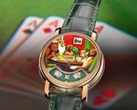 “Reflet miniature de la célèbre toile « A Bold Bluff » de Cassius Marcellus Coolidge, cette pièce exceptionnelle révèle bien des secrets. L’affichage de l’heure sur la carrure entre les attaches à 6 heures permet une lecture discrète, pleine de tact, tandis que la face « tableau » se prête à une personnalisation sans limite selon les désirs, avoués ou non, du porteur. Les amateurs de poker seront en outre bluffés de voir que le guichet du cadran dévoile les showdowns de leur jeu favori.”