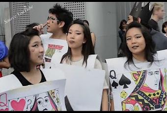 Ici c’est une troupe de Lakorn dans les rues de Bangkok dans un flashmob tonique sous les yeux amusés des passants et une grosse participation d’un public bon enfant.