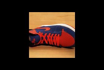 Les sneakers combinent du cuir orange et cuir bleu contrastés par une semelle intermédiaire blanche. On peut remarquer qu’il y a le logo ‘Nike Air’ sur la le tag de la languette et l’absence du logo Jumpman au niveau du talon.