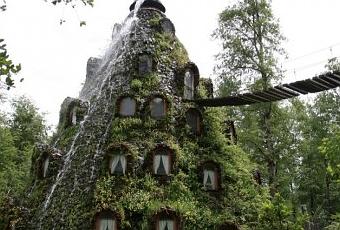 Le Montaña Mágica est un hôtel situé au cœur de la réserve biologique de Huilo Huilo, en Patagonie. C’est un hôtel hors du commun car il est en forme de volcan avec une cascade d’eau s’échappant du sommet.