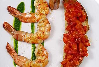 Ce plat, j'en ai eu l'idée en tombant nez à nez avec des gambas tigrées (vous savez ces gambas géantes...). J'avais envie de les associer avec des produits du soleil... Ce sera une fondue de poivron rouge à l'ail et au piment d'Espelette et un pesto de persil (pour le goût et la couleur !)... Allez c'est partie, se n'est pas compliqué !!!!