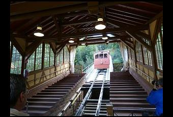 En tout, les deux sections font un trajet d'environ 1,5 km, la pente oscillant entre 22% et ... 43% ! C'est particulièrement impressionnant, même si on connaît le principe de ces nacelles, qui fonctionne un peu comme celui des vases communiquants : c'est la cabine qui descend qui permet à l'autre de monter, on se croise au milieu.