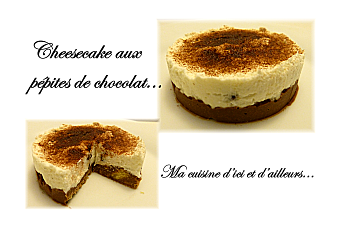 Bonjour, Je participe au tour gourmand sur le thème des charlottes et cheesecake organisé par le site un tour en cuisine. J'ai choisi de réaliser un cheesecake sans cuisson et forcément, par pure gourmandise, d'y ajouter une "touche" de chocolat !!! Mêmemon petit dernier qui n'est pas fan de dessert à tout mangé !!! Pour 3 petits cheesecakes, il vous faut: 50 gr de biscuits secs (Mc Vities pour nous) 80 gr de chocolat au caramel 100 gr de fromage frais type "Philadelphia" 80 gr de ricotta 15 gr de sucre glace 1/2 gousse de vanille cacao en poudre pépites de chocolat Faîtes fondre le chocolat au caramel au bain-marie. Ajoutez les biscuits secs écrasés, mélangez. Tapissez le fond de 3 cercles avec cette préparation et réservez au frais. Mélangez le fromage frais et la ricotta jusqu'à l'obtention d'un mélange lisse. Ajoutez l'intérieur de la gousse de vanille avec le sucre glace et les pépites de chocolat. Répartissez la préparation à l'intérieur des cercles. Réservez au frais pendant 2 heures minimum. Retirez les cercles et saupoudrez de cacao en poudre avant de servir... Bon appétit !!