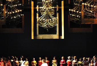 Le spectacle, mis en scène par Gabor Szücs, se veut moderne, ou modernisant : dans l’espace de la scène quelques éléments de décor métalliques descendent des cintres (pont, escalier) quelques projections, des costumes de Enikö Kárpáti contemporains se mêlent à des costumes médiévaux ou du XIXème comme si le héros, était une métaphore de l’histoire de la Hongrie ballotée entre les envahisseurs, les traitres, qui empêchent la vraie Hongrie d’éclore. De fait, László Hunyadi n’a pas grand-chose à faire dans cette œuvre, il n’agit pas, ne cesse de protester de son honnêteté et de sa pureté, pendant que tout ce qui l’entoure en est jaloux et veut sa fin. En bref, il meurt sans rien avoir fait dans l’opéra, puisque même Cilley a été tué par ses partisans. Seul soleil de cette vie, Maria, qui va être victime de son père, comme les grandes héroïnes du bel canto romantique.