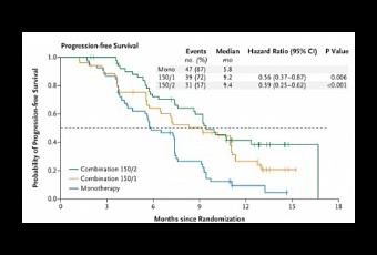 41% des patients sans progression de la maladie : Après un an de traitement, 41% des patients recevant le traitement combiné à dose complète montrent une absence de progression de leur cancer, vs seulement 9% de ceux n'ayant reçu qu'un médicament. Les effets indésirables constatés avec la combinaison sont identiques à ceux observés avec seulement l'un des deux médicaments.