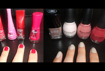 1. On se pose une base, et on choisit 3-4 vernis assortis. ça sera dans les tons rouge/rose pour Amélie (à gauche, si vous suivez bien), et un dégradé nude/rosé pour Amandine (à droite, donc...)